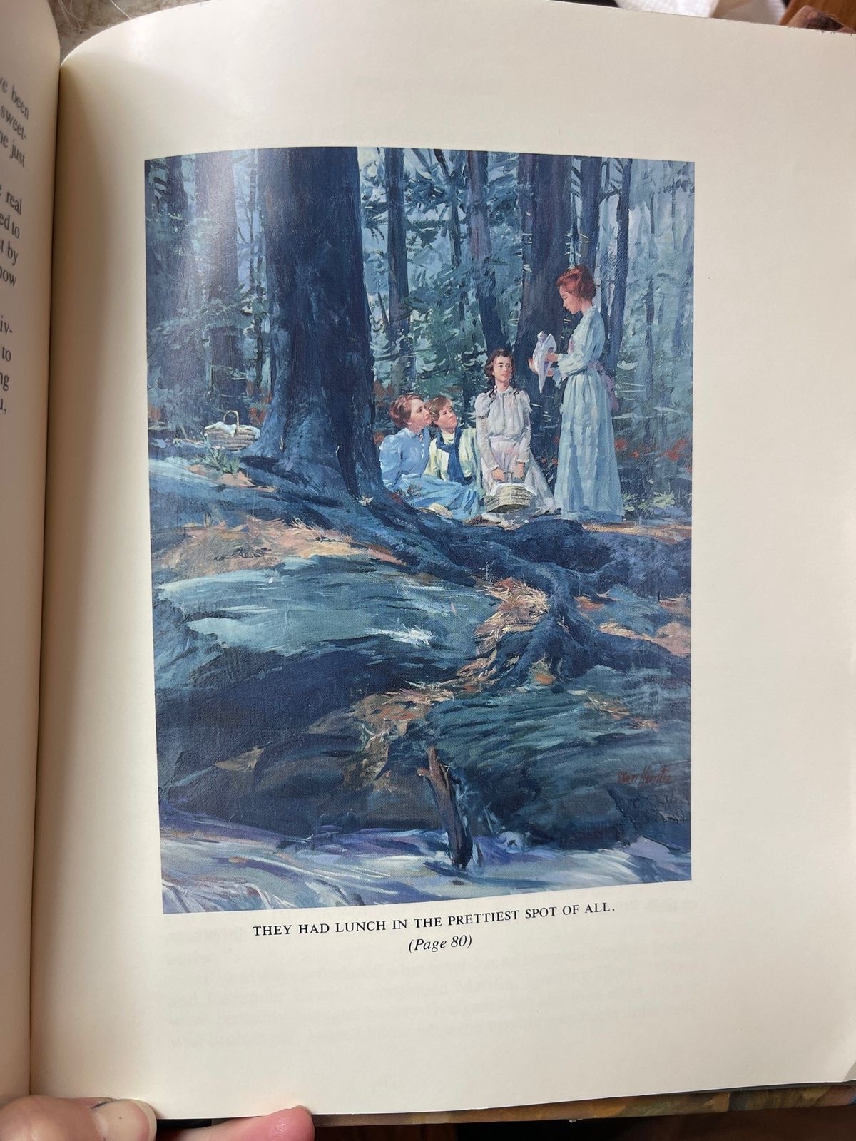 Anne of Avonlea and Anne of the Island I love nearly as much as the first book. (I’ll hold my comments about Windy Poplars for another time). Avonlea has Anne’s adventures in the AVIS (especially the Tory Road incident), her time as a schoolmarm, the introduction of Mr. Harrison and the Keith twins, Miss Lavender and Echo Lodge, and all the usual outdoor romps and domestic details that make these stories wonderful.